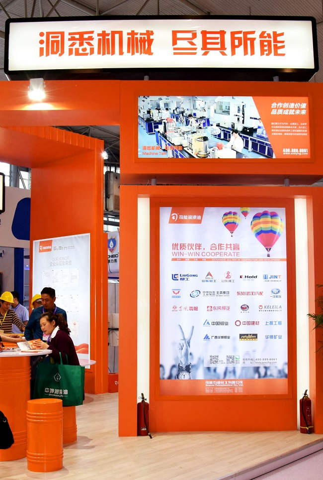 司能延續“一帶一路”理念,以穿插的展臺結構,重工的機械風格,帶你重走不一樣的絲綢之路。以司能橘及暖灰為主打色調,簡潔的集裝箱元素布局全場,前廳,大幅燈箱畫面展現公司實力。后場,各子品牌產品以實物及畫面的形式共同展示。
